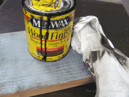 8. Use a wood stain over the paint. This is the most expensive part of the project. Wood stain is about $8 at Home Depot, but it will last you a lifetime! You literally use a dab of this stain for each board. I love Minwax Jacobean for most projects.